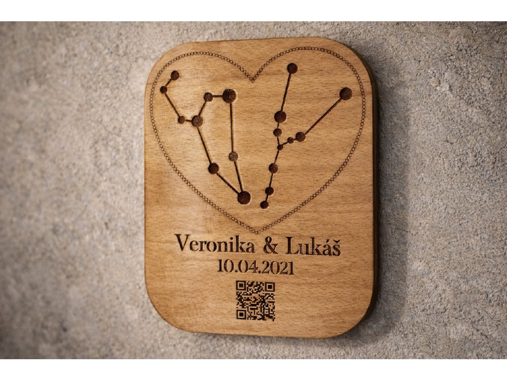 Dřevěná dekorace s párovým znamením, jmény, datem nebo QR kódem