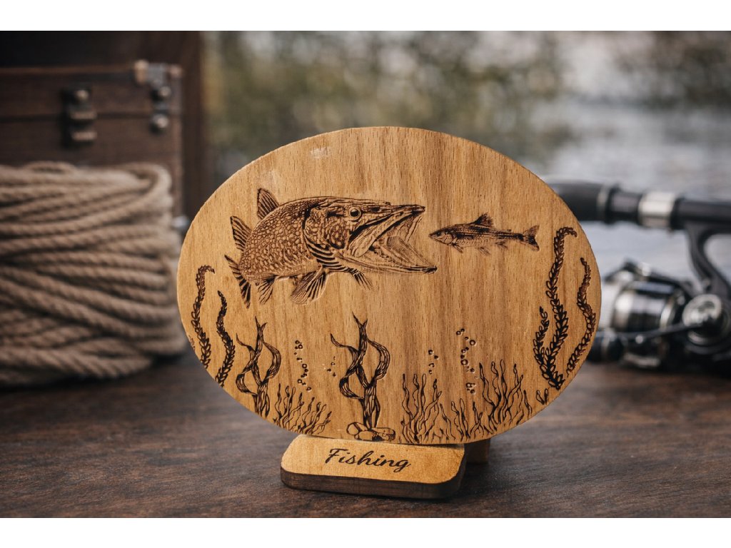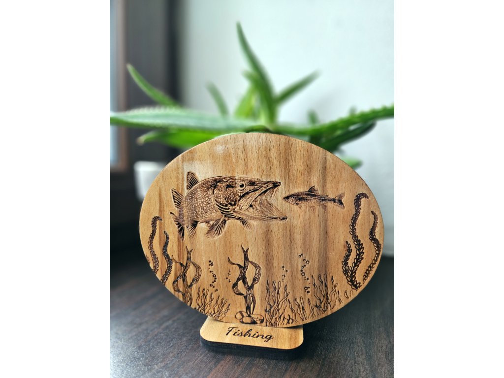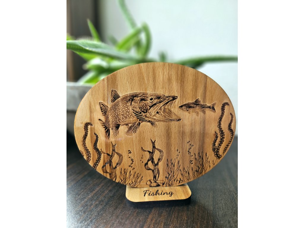 Dřevěná dekorace štika – gravírovaná na podstavci