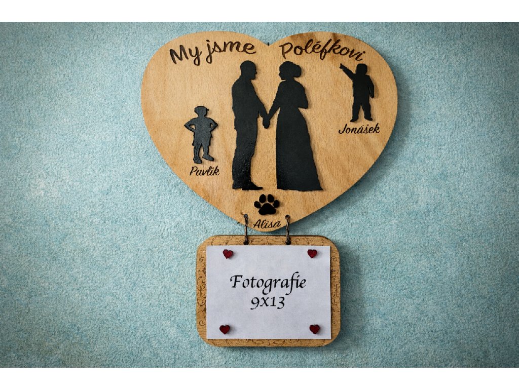 Dřevěné srdce s rodinnou siluetou nebo gravírovanou fotografií – dekorace na míru