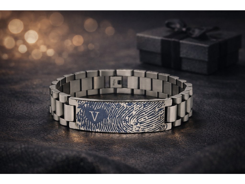 Nerezový pánský náramek s klíčenkou – gravírovaný otisk prstu, iniciály a text