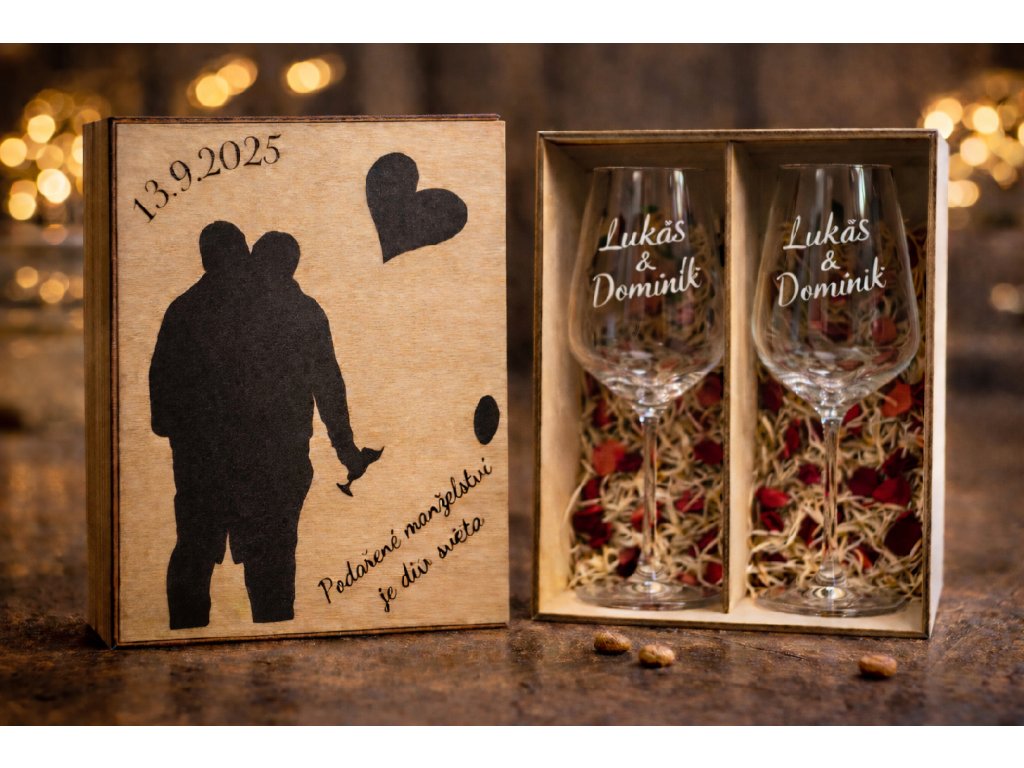 🌟 Ideální svatební dar, narozeninový dárek nebo originální památka na společné chvíle. Spojení sklenic s personalizovaným boxem vytvoří vzpomínku na celý život.